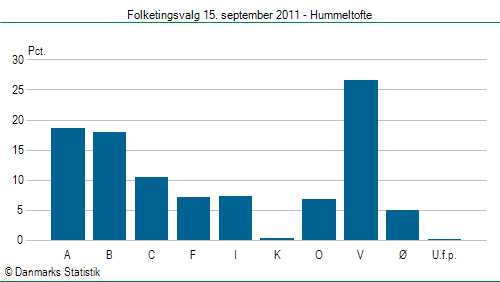 | Stemmer | | Parti | Antal | Pct. | | | | A. Socialdemokratiet | 600 | 18,5% | | B. Radikale Venstre | 580 | 17,9% | | C. Det Konservative Folkeparti | 341 | 10,5% | | F. SF - Socialistisk Folkeparti | 232 | 7,2% | | I. Liberal Alliance | 234 | 7,2% | | K. Kristendemokraterne | 9 | 0,3% | | O. Dansk Folkeparti | 222 | 6,8% | | V. Venstre, Danmarks Liberale Parti | 862 | 26,6% | | Ø. Enhedslisten - De Rød-Grønne | 159 | 4,9% | | Uden for partierne | 2 | 0,1% | | I alt gyldige stemmer | 3.241 | | | Blanke stemmer | 11 | | Andre ugyldige stemmer | 5 | | I alt ugyldige stemmer | 16 | | | I alt afgivne stemmer | 3.257 | |