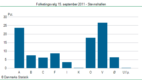 | Stemmer | | Parti | Antal | Pct. | | | | A. Socialdemokratiet | 907 | 23,7% | | B. Radikale Venstre | 285 | 7,4% | | C. Det Konservative Folkeparti | 232 | 6,1% | | F. SF - Socialistisk Folkeparti | 330 | 8,6% | | I. Liberal Alliance | 133 | 3,5% | | K. Kristendemokraterne | 8 | 0,2% | | O. Dansk Folkeparti | 680 | 17,7% | | V. Venstre, Danmarks Liberale Parti | 1.016 | 26,5% | | Ø. Enhedslisten - De Rød-Grønne | 241 | 6,3% | | Uden for partierne | 1 | 0,0% | | I alt gyldige stemmer | 3.833 | | | Blanke stemmer | 34 | | Andre ugyldige stemmer | 6 | | I alt ugyldige stemmer | 40 | | | I alt afgivne stemmer | 3.873 | |
