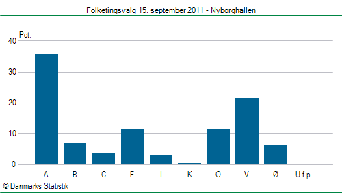| Stemmer | | Parti | Antal | Pct. | | | | A. Socialdemokratiet | 1.502 | 35,7% | | B. Radikale Venstre | 290 | 6,9% | | C. Det Konservative Folkeparti | 148 | 3,5% | | F. SF - Socialistisk Folkeparti | 471 | 11,2% | | I. Liberal Alliance | 131 | 3,1% | | K. Kristendemokraterne | 16 | 0,4% | | O. Dansk Folkeparti | 488 | 11,6% | | V. Venstre, Danmarks Liberale Parti | 902 | 21,4% | | Ø. Enhedslisten - De Rød-Grønne | 260 | 6,2% | | Uden for partierne | 5 | 0,1% | | I alt gyldige stemmer | 4.213 | | | Blanke stemmer | 21 | | Andre ugyldige stemmer | 32 | | I alt ugyldige stemmer | 53 | | | I alt afgivne stemmer | 4.266 | |