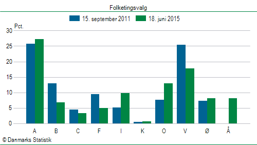 | Stemmer | | Parti | Antal | Pct. | | | | A. Socialdemokratiet | 13.623 | 27,2% | | B. Radikale Venstre | 3.375 | 6,7% | | C. Det Konservative Folkeparti | 1.655 | 3,3% | | F. SF - Socialistisk Folkeparti | 2.509 | 5,0% | | I. Liberal Alliance | 4.902 | 9,8% | | K. Kristendemokraterne | 349 | 0,7% | | O. Dansk Folkeparti | 6.483 | 13,0% | | V. Venstre, Danmarks Liberale Parti | 8.909 | 17,8% | | Ø. Enhedslisten - De Rød-Grønne | 4.044 | 8,1% | | Å. Alternativet | 4.064 | 8,1% | | Uden for partierne | 132 | 0,3% | | I alt gyldige stemmer | 50.045 | | | Blanke stemmer | 420 | | Andre ugyldige stemmer | 125 | | I alt ugyldige stemmer | 545 | | | I alt afgivne stemmer | 50.590 | |