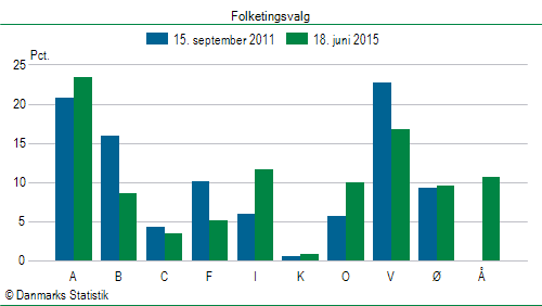 | Stemmer | | Parti | Antal | Pct. | | | | A. Socialdemokratiet | 13.362 | 23,3% | | B. Radikale Venstre | 4.881 | 8,5% | | C. Det Konservative Folkeparti | 1.936 | 3,4% | | F. SF - Socialistisk Folkeparti | 2.932 | 5,1% | | I. Liberal Alliance | 6.650 | 11,6% | | K. Kristendemokraterne | 486 | 0,8% | | O. Dansk Folkeparti | 5.706 | 10,0% | | V. Venstre, Danmarks Liberale Parti | 9.599 | 16,8% | | Ø. Enhedslisten - De Rød-Grønne | 5.432 | 9,5% | | Å. Alternativet | 6.082 | 10,6% | | Uden for partierne | 181 | 0,3% | | I alt gyldige stemmer | 57.247 | | | Blanke stemmer | 521 | | Andre ugyldige stemmer | 183 | | I alt ugyldige stemmer | 704 | | | I alt afgivne stemmer | 57.951 | |