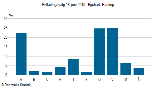 | Stemmer | | Parti | Antal | Pct. | | | | A. Socialdemokratiet | 288 | 22,5% | | B. Radikale Venstre | 27 | 2,1% | | C. Det Konservative Folkeparti | 21 | 1,6% | | F. SF - Socialistisk Folkeparti | 52 | 4,1% | | I. Liberal Alliance | 106 | 8,3% | | K. Kristendemokraterne | 19 | 1,5% | | O. Dansk Folkeparti | 318 | 24,8% | | V. Venstre, Danmarks Liberale Parti | 322 | 25,1% | | Ø. Enhedslisten - De Rød-Grønne | 81 | 6,3% | | Å. Alternativet | 47 | 3,7% | | I alt gyldige stemmer | 1.281 | | | Blanke stemmer | 12 | | Andre ugyldige stemmer | 4 | | I alt ugyldige stemmer | 16 | | | I alt afgivne stemmer | 1.297 | |