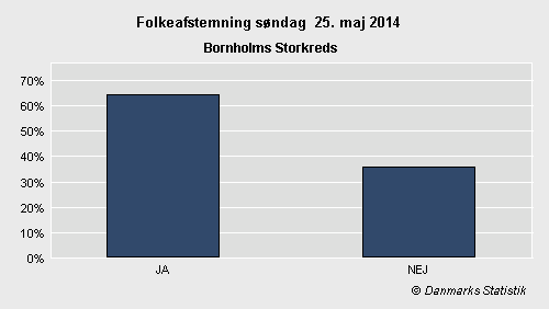 | Stemmer | | Parti | Antal | Pct. | | | | JA | 10.109 | 64,2% | | NEJ | 5.649 | 35,8% | | I alt gyldige stemmer | 15.758 | | | Blanke stemmer | 682 | | Andre ugyldige stemmer | 41 | | I alt ugyldige stemmer | 723 | | | I alt afgivne stemmer | 16.481 | |