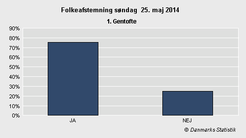 | Stemmer | | Parti | Antal | Pct. | | | | JA | 24.380 | 75,2% | | NEJ | 8.047 | 24,8% | | I alt gyldige stemmer | 32.427 | | | Blanke stemmer | 770 | | Andre ugyldige stemmer | 94 | | I alt ugyldige stemmer | 864 | | | I alt afgivne stemmer | 33.291 | |