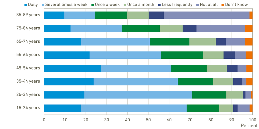 Of the 25-34-year-olds, 87 per cent used the services at least once a week. The 85-89-year-olds are the least active with 40 per cent using the services at least once a week.