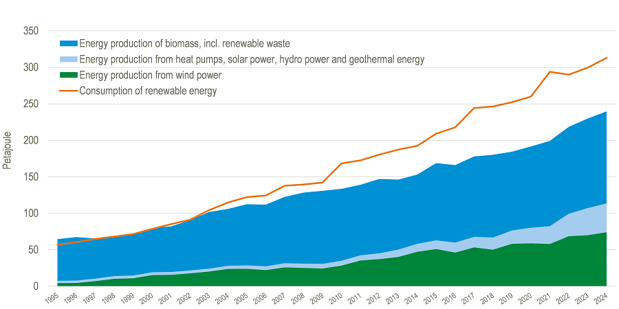 The increase in renewable energy production comes especially from biomass. Biomass is, for example, straw, wood pellets or organic waste, which we burn to use the energy. The emission from biomass incineration has more than quadrupled since 1990.