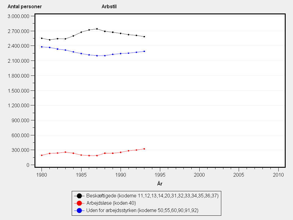 Den detaljerede underopdeling af personerne uden for arbejdsstyrken er ikke publiceret af Danmarks Statistik for 1994 og 1995.
