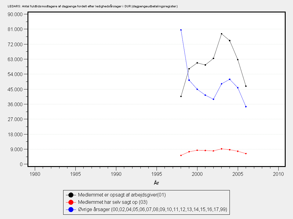 Bemærk, at niveauet for antallet af medlemmer, der var ledige ved etableringen af DUR pr. 1. juli 1997 (ledighedsårsag uoplyst), faldt kraftigt fra 1998 til 1999, hvilket medførte en tilsvarende stigning i 1999 for de øvrige årsagskoder.