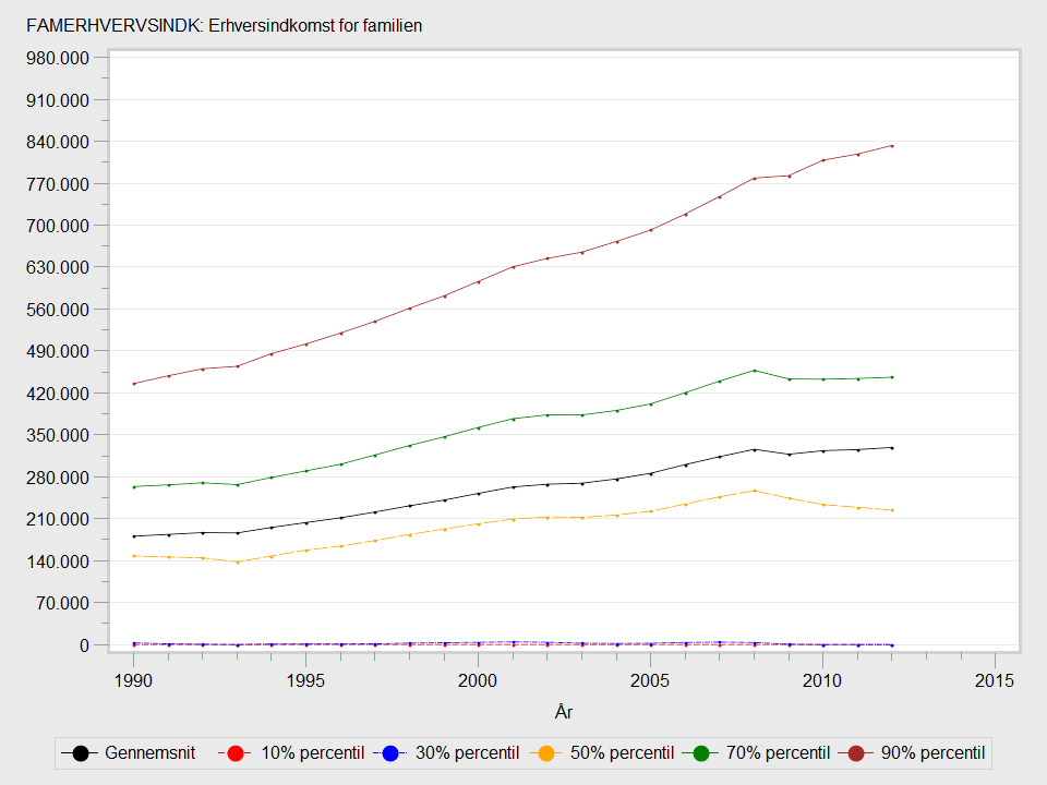 Populationen i datasæt, som udleveres af Forskningsservice, omfatter alle familier, som var bosiddende i Danmark 31. december i indkomståret. I publikationer og statistikbanktabeller inkluderes kun familier, hvor mindst én voksen har været bosiddende i Danmark både primo og ultimo året (fuldt skattepligtige), og som ved årets udgang er mindst 15 år. For at genskabe denne population skal det betinges, at FAMANTALFSKATTEPLIGTIGE > 0. I vedhæftede tabel og graf er populationen den samme som den, Danmarks Statistik publicerer på, hvor FAMANTALFSKATTEPLIGTIGE > 0.