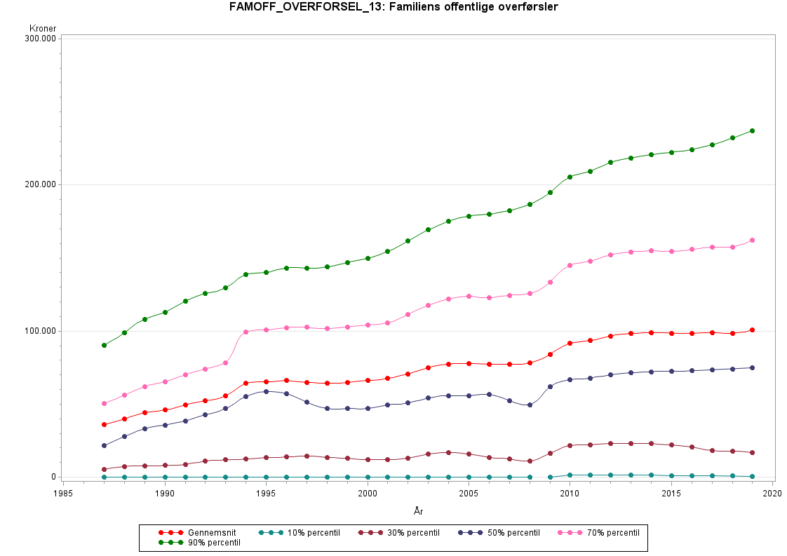 FAMOFF_OVERFORSEL_13 er en sumvariabel der består af alle overførsler, som primært finansieres af det offentlige inkl. dagpenge og efterløn, men eksl. tjenestemandspension.FAMOFF_OVERFORSEL_13 er baseret på OFF_OVERFORSEL_13 fra Personindkomster og er offentlige overførslelsindkomster for alle personer, der tilhører den samme familie pr. 31. december i indkomståret (dvs. har samme E-familienummer), inkl. hjemmeboende børn under 25 år.