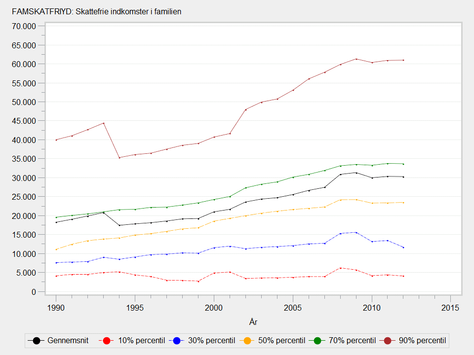 1994: Størstedelen af kontanthjælpen hæves og gøres skattepligtig, hvilket reducerer FAMSKATFRIYD fra 1994. En lille del er dog stadigvæk skattefri; denne del indgår ikke i opgørelserne fra 1994 til 2001.