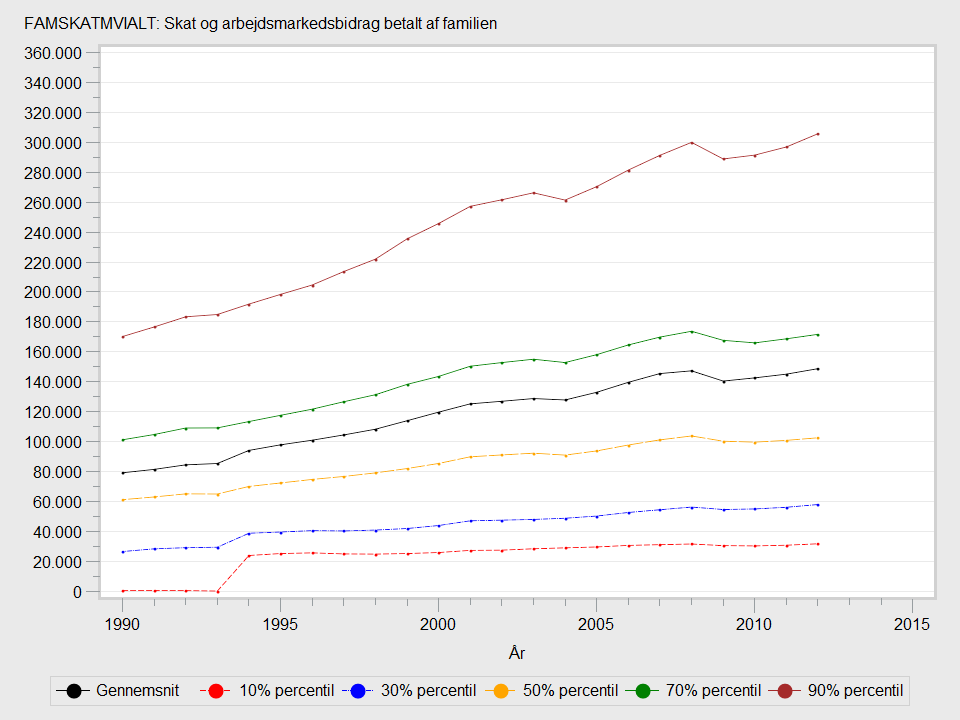 Populationen i datasæt, som udleveres af Forskningsservice, omfatter alle familier, som var bosiddende i Danmark 31. december i indkomståret. I publikationer og statistikbanktabeller inkluderes kun familier, hvor mindst én voksen har været bosiddende i Danmark både primo og ultimo året (fuldt skattepligtige), og som ved årets udgang er mindst 15 år. For at genskabe denne population skal det betinges, at FAMANTALFSKATTEPLIGTIGE > 0. I vedhæftede tabel og graf er populationen den samme som den, Danmarks Statistik publicerer på, hvor FAMANTALFSKATTEPLIGTIGE > 0.
