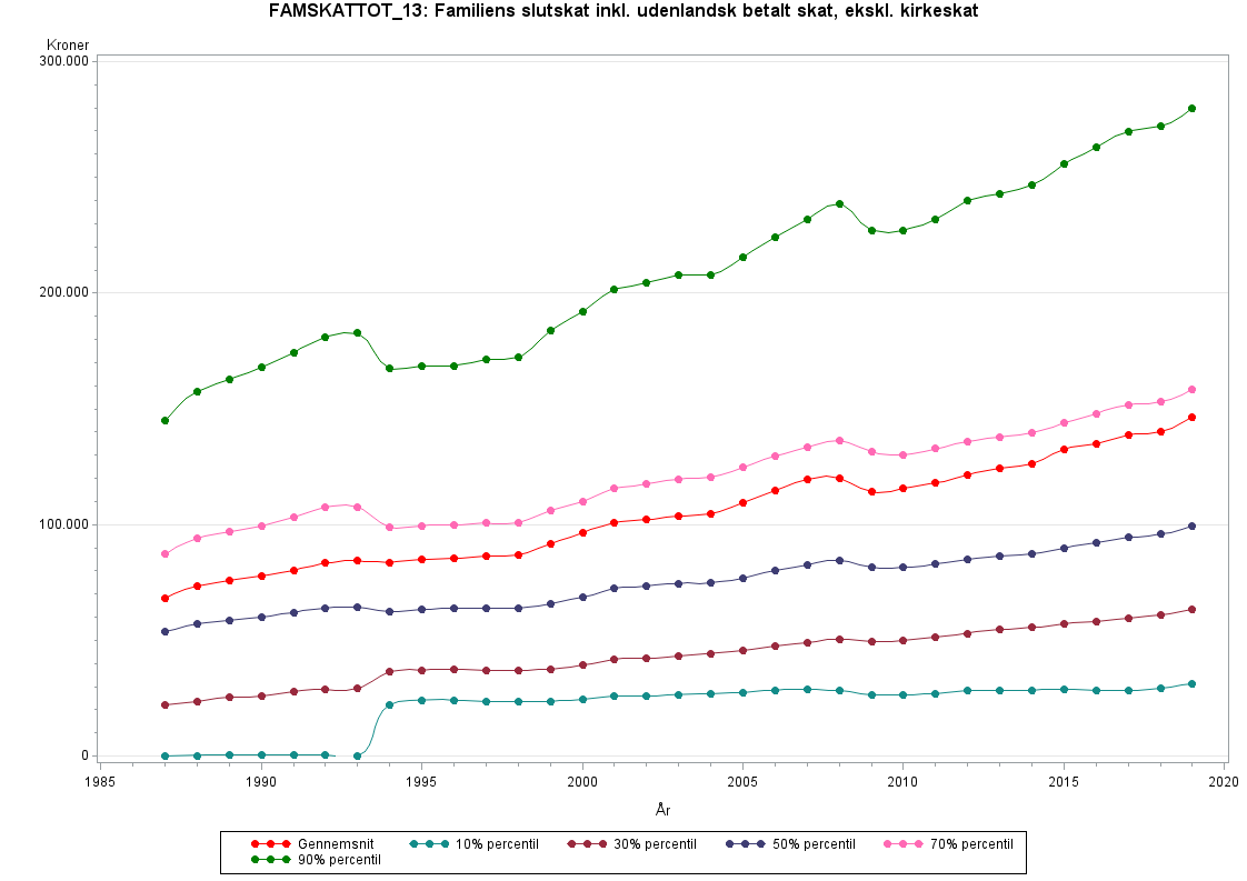 Populationen i datasæt, som udleveres af Forskningsservice, omfatter alle familier, som var bosiddende i Danmark 31. december i indkomståret. I publikationer og statistikbanktabeller inkluderes kun familier, hvor mindst én voksen har været bosiddende i Danmark både primo og ultimo året (fuldt skattepligtige), og som ved årets udgang er mindst 15 år. For at genskabe denne population skal det betinges, at FAMANTALFSKATTEPLIGTIGE > 0. I vedhæftede tabel og graf er populationen den samme som den, Danmarks Statistik publicerer på, hvor FAMANTALFSKATTEPLIGTIGE > 0.