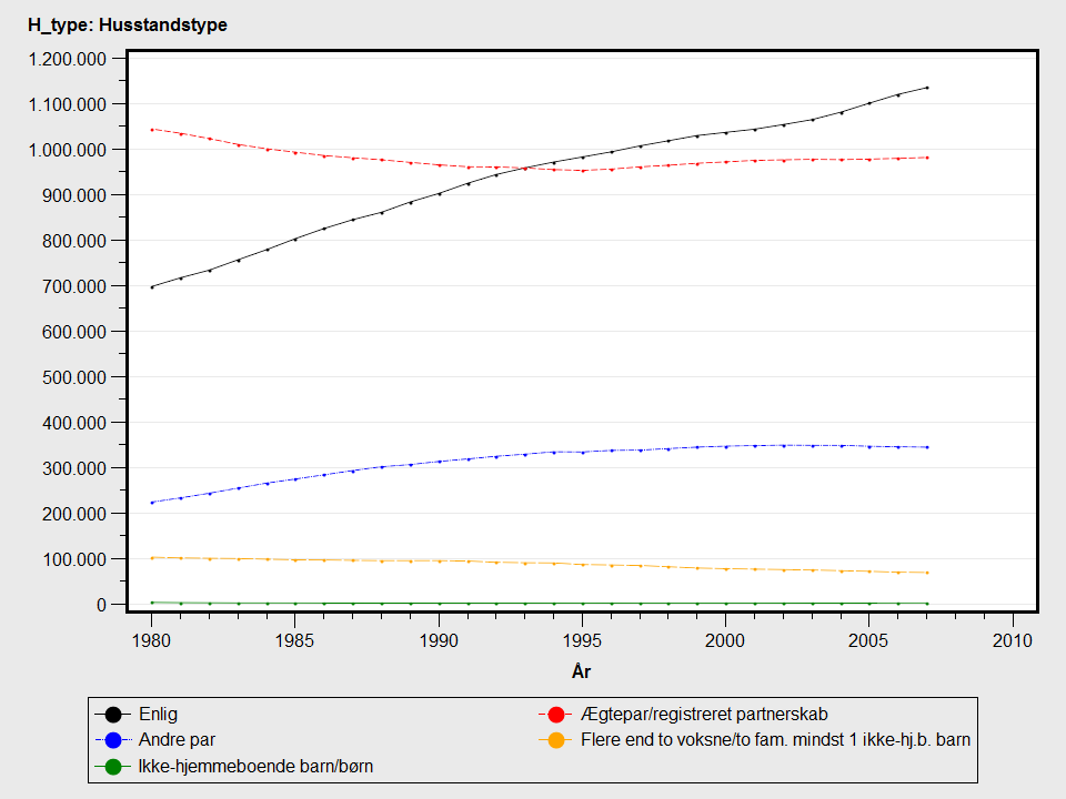 | 211 | To enlige af hvert sit køn. Ingen hjemmeboende børn. Eventuelt er der voksne hjemmeboende børn | 01-01-1980 | 02-01-2007 |