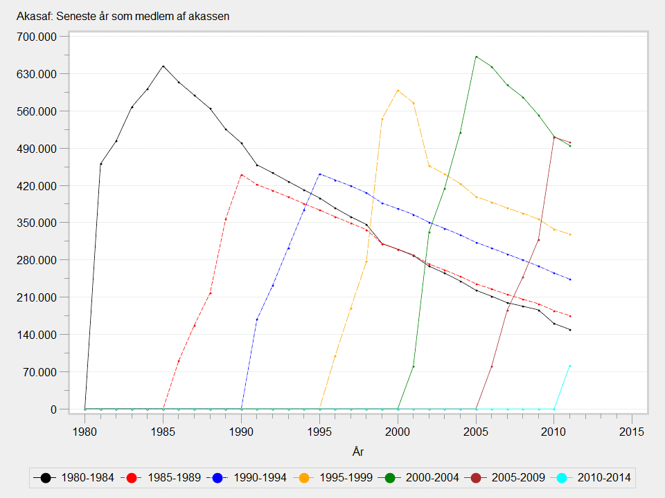 I IDA-2007 er der 118.526 personer, der har afsluttet et a-kassemedlemsskab i 1980, 12.320 afsluttede i 1981, 24.956 afsluttede i 1982 etc.