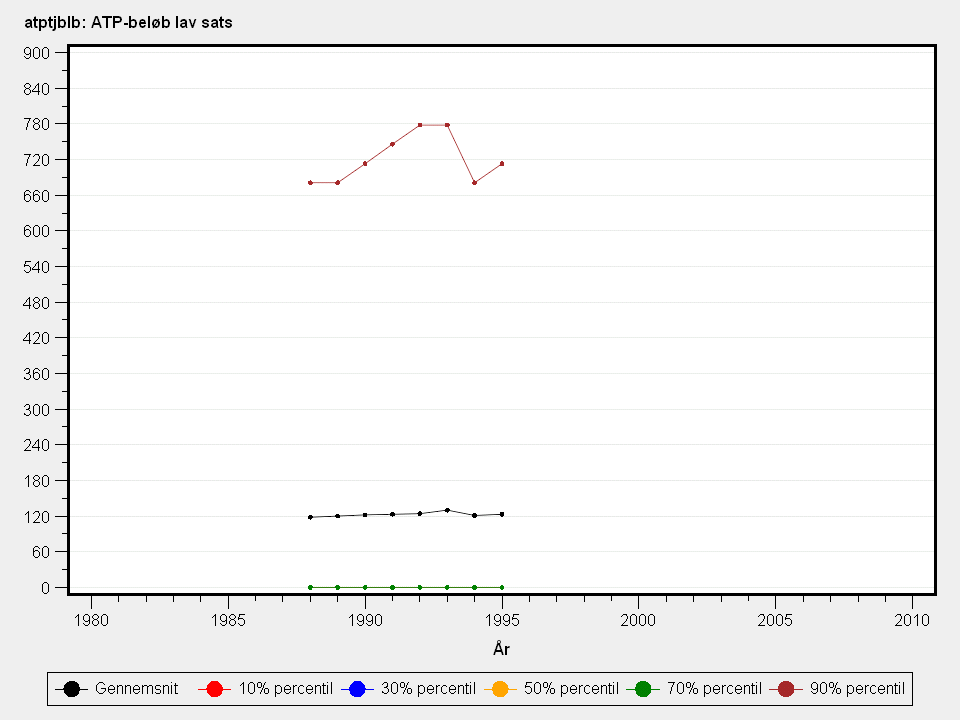 ATP-ordningen er ændret løbende i perioden. Der er databrud i forhold til, at maksimum-beløbene ændres over tid, men det giver ikke brud i statistikkens fuldtidsbeskæftigelse, som er beregnet på grundlag af indbetaling til ATP.Fra 1980 til 1987 er der kun én sats (se ATPBLB (ATP-beløb)). Fra 1988 indføres en ny ATP-sats. Variablen ATPTJBLB indeholder herefter beløbet på lav sats. Fuld ATP-beløb lav sats for en ansat på fuld tid i hele kalenderåret er kr. 1166 i årene 1988-1995.