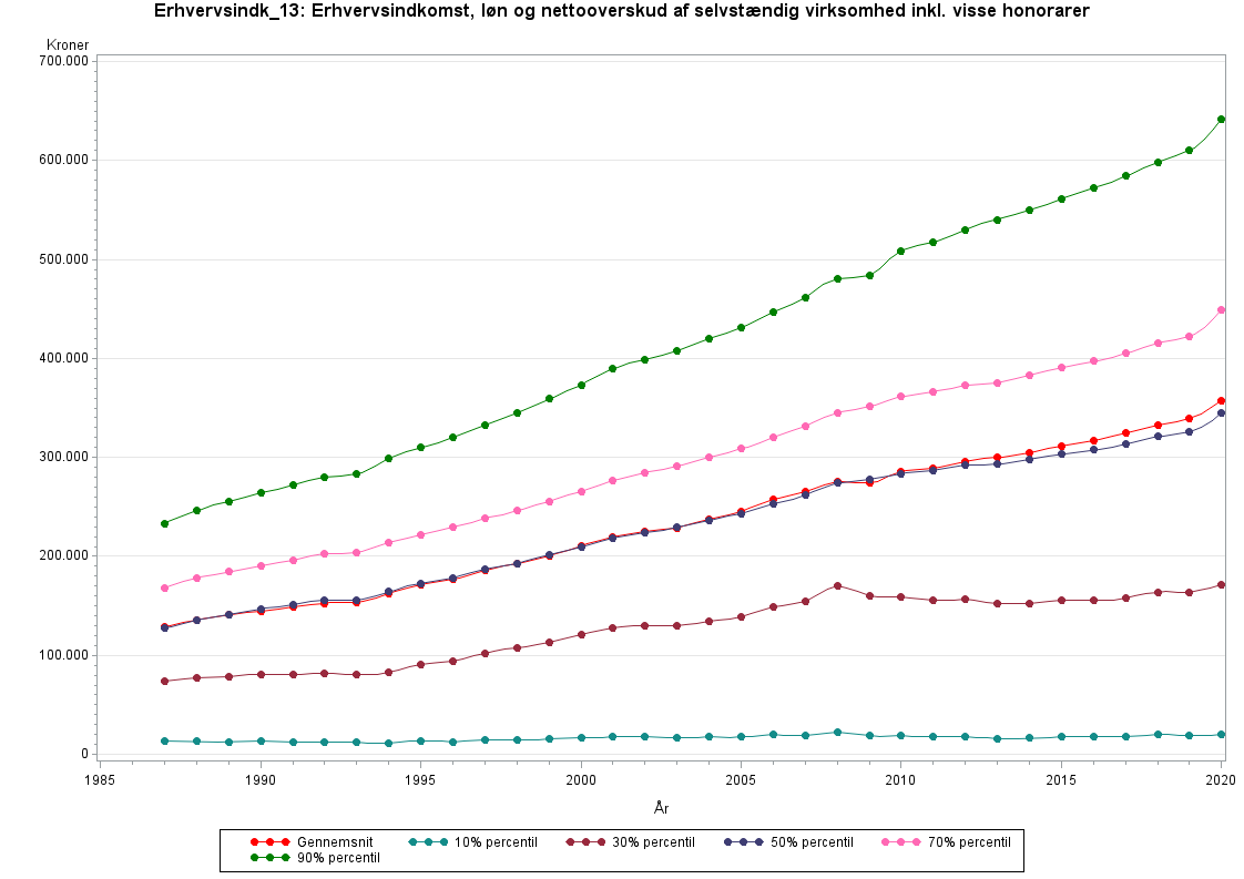 Populationen, som udleveres af Forskningsservice, består af personer som er i befolkningen pr. 31. 12 i indkomståret, samt alle der er registreret i Skats Slutligningsregister med en indkomst eller formue (inkl. udvandrede og døde i løbet af året). Fra 2004 indgår også ikke-skattepligtige personer, se nærmere i bilaget "Population i personindkomsterne" under beskrivelse af personindkomst (http://www.dst.dk/da/TilSalg/Forskningsservice/Dokumentation/hoejkvalitetsvariable/personindkomster). I vedhæftede graf og tabel er populationen afgrænset til de personer, der findes i Statistikbanken og i publikationer samt med den ekstra betingelse, at per-sonen skal have erhvervsindkomst forskellig fra nul. Det svarer til alle perso-ner, som er fuldt skattepligtige hele året, har bopæl i Danmark både primo og ultimo året og er mindst 15 år ved årets udgang, og hvor erhvervsindkomst er forskellig fra nul. Denne population findes ved at sætte variablen OMFANG=1, alderen ultimo året større end 14 og ERHVERVSINDKOMST_13 forskellig fra nul.