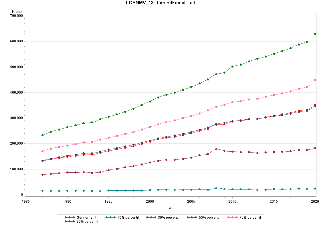 Populationen, som udleveres af Forskningsservice, består af personer som er i befolkningen pr. 31. 12 i indkomståret, samt alle der er registreret i Skats Slutligningsregister med en indkomst eller formue (inkl. udvandrede og døde i løbet af året). Fra 2004 indgår også ikke-skattepligtige personer, se nærmere i bilaget "Population i personindkomsterne"under beskrivelse af personindkomst (http://www.dst.dk/da/TilSalg/Forskningsservice/Dokumentation/hoejkvalitetsvariable/personindkomster). I vedhæftede graf og tabel er populationen afgrænset til de personer, der findes i Statistikbanken og i publikationer samt med den ekstra betingelse, at personen skal have et beløb forskelligt fra nul. Det svarer til alle personer, som er fuldt skattepligtige hele året, har bopæl i Danmark både primo og ultimo året og er mindst 15 år ved årets udgang, og hvor beløbet er forskelligt fra nul. Denne population findes ved at sætte variablen OMFANG=1, samt alderen ultimo året større end 14 og beløbet forskelligt fra nul.