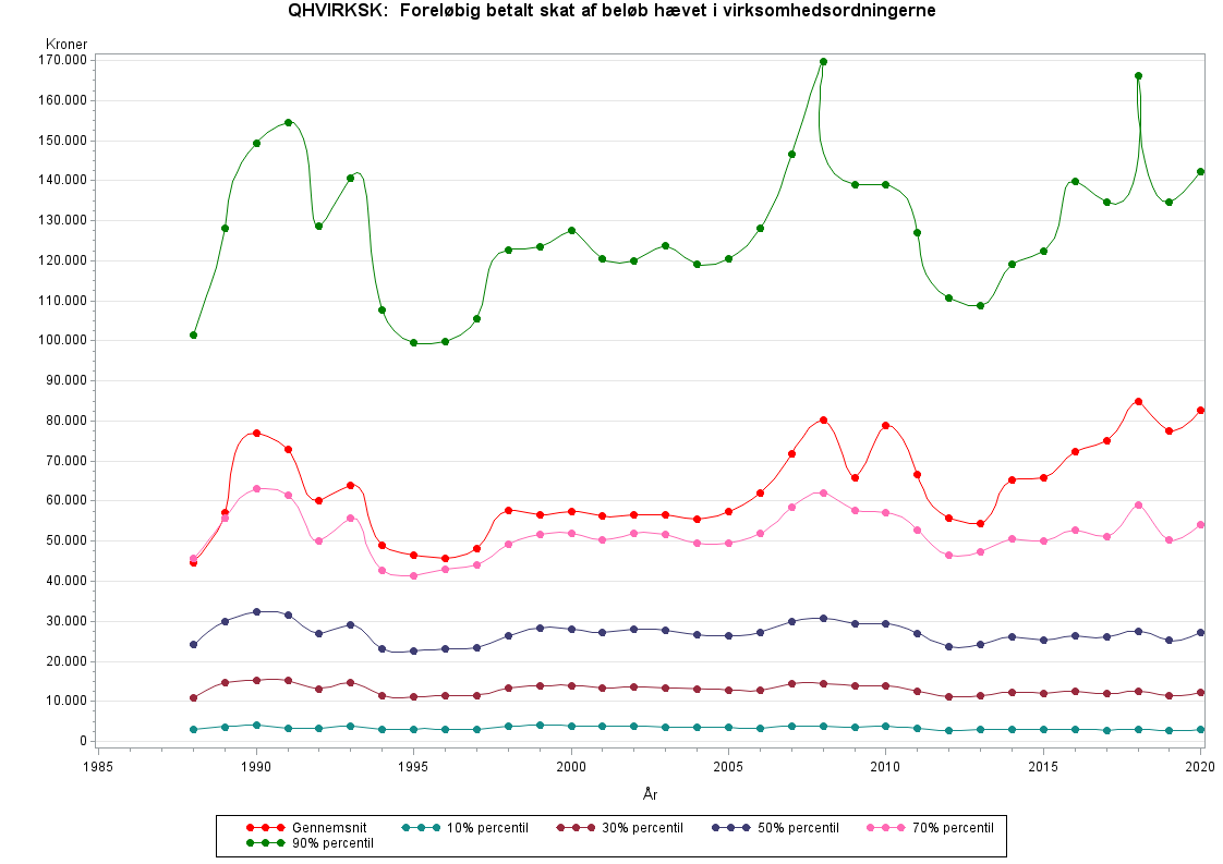 Bemærk at QHVIRKSK afhænger af, hvilket år de hævede beløb blev opsparet på virksomhedsordningen, idet skattesatsen af de opsparede beløb har varieret.