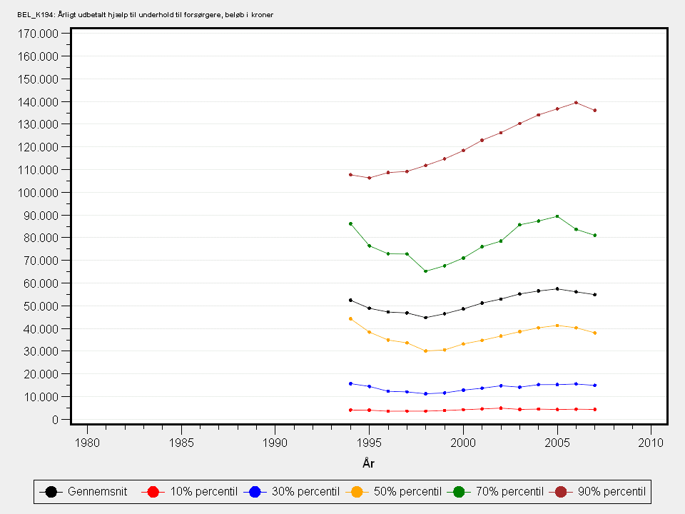 Årligt udbetalt hjælp til underhold/forsørgelse til forsørgere. Beløb i hele kroner.