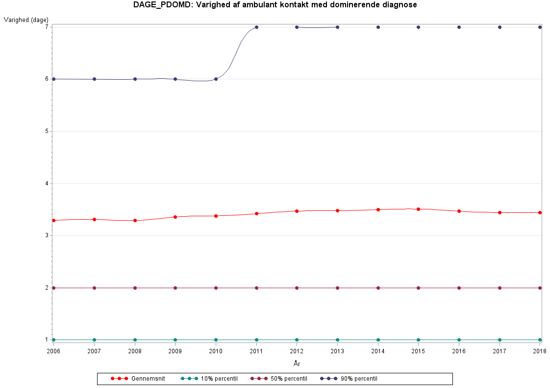 DAGE_PDOMD angiver varigheden (målt i dage) af patientens hhv. indlæggelser og ambulante kontakter i forbindelse med den dominerende diagnose PDOMD.Bemærk at varigheden af indlæggelser kan være længere end 365 dage, da den udregnes fra indlæggelsesdatoen, som kan være i et tidligere år. Med hensyn til de ambulante kontakter angiver variablen antallet af dage med ambulante besøg i løbet af året.