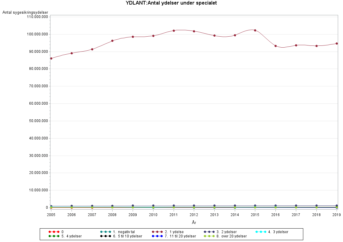 YDLANT (antal ydelser under specialet) angiver antallet af ens ydelser på den pågældende record. Dvs. antallet af ens ydelser pr. regning fra læge mv. til sygesikringen.Detaljeret beskrivelse