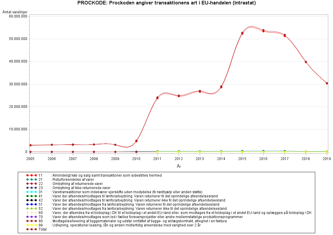 I EU-handelen (Intrastat) anvendes de 2-cifrede transaktionsartskoder. I handelen med tredjelande (Extrastat) anvendes de 7-cifrede toldprocedurekoder.